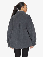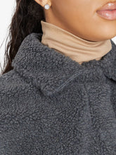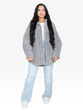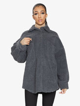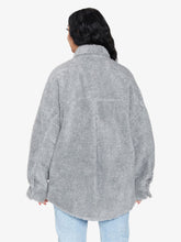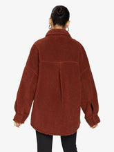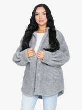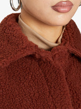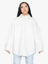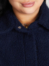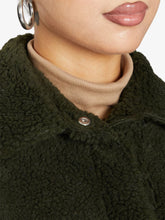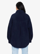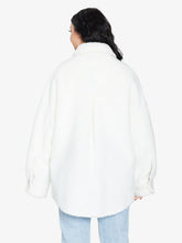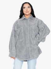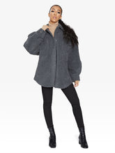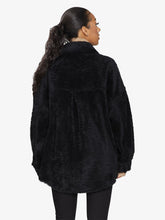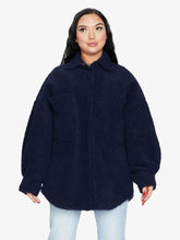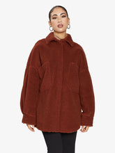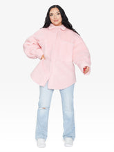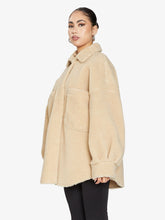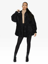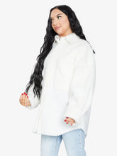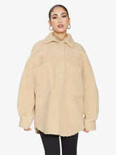 An oversized fitting shacket in borg teddy material with large patch pocket design. Features stud button fastening and collared. Presented by De La Creme Fashions. Made in England using domestic and imported materials.