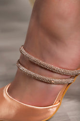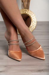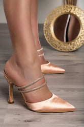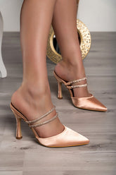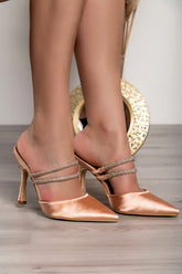 High-heeled shoes are made of high-quality materials that guarantee complete comfort when walking. The shoes have a pointed toe and two straps with decorative stones. The heel is thin. They are available up to size 41.